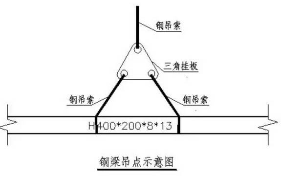 鋼梁的綁扎吊點尤為重要,在鋼梁過長可采取鋼扁擔(dān),本工程有許多鋼梁最長為20m左右,用三角形掛板把鋼絲繩間距放大,來增大鋼絲繩夾角符合本次吊裝要求。鋼梁綁扎示意圖。