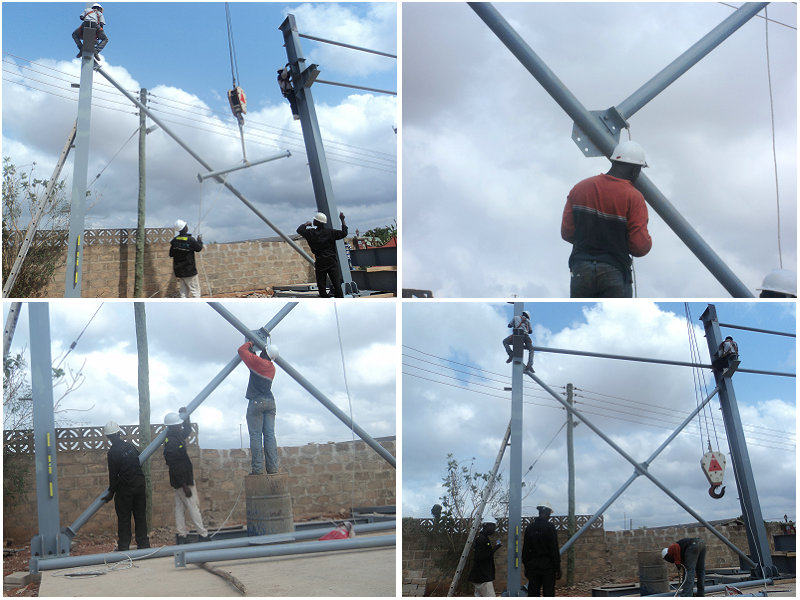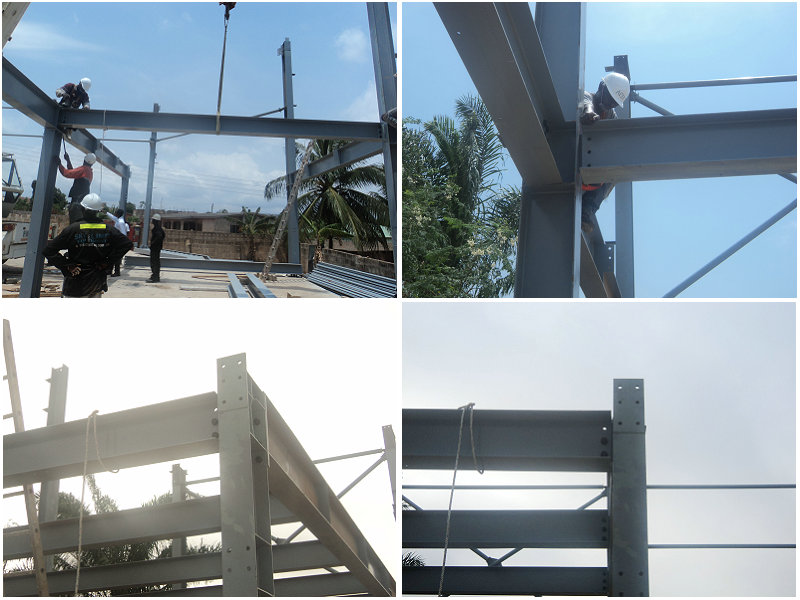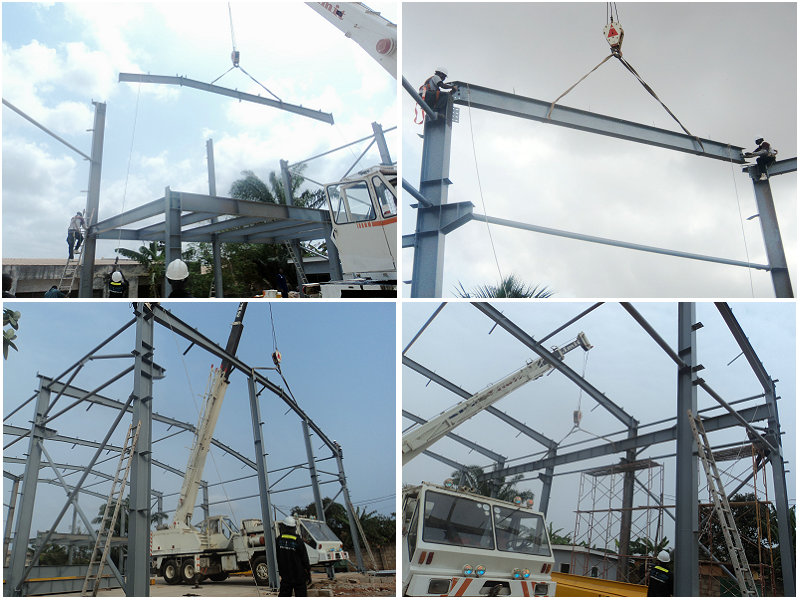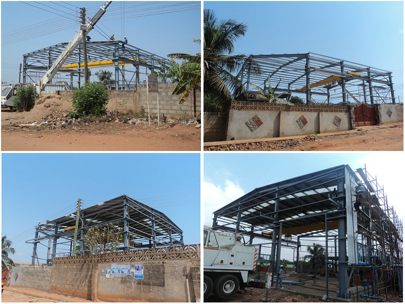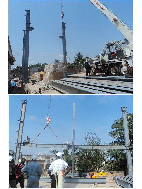 加納車間位于非洲國(guó)家,此車間設(shè)計(jì)有10噸吊機(jī),主要用于生產(chǎn)起吊使用。車間的安裝需要先裝好鋼柱,然后裝行車,最后才是封頂,這樣才不會(huì)影響吊機(jī)的安裝。此車間由勝邦鋼構(gòu)公司派遣技術(shù)人員指導(dǎo)安裝,此車間的安裝時(shí)間僅用了1個(gè)月的時(shí)間。以下是建筑的部分安裝圖片展示: